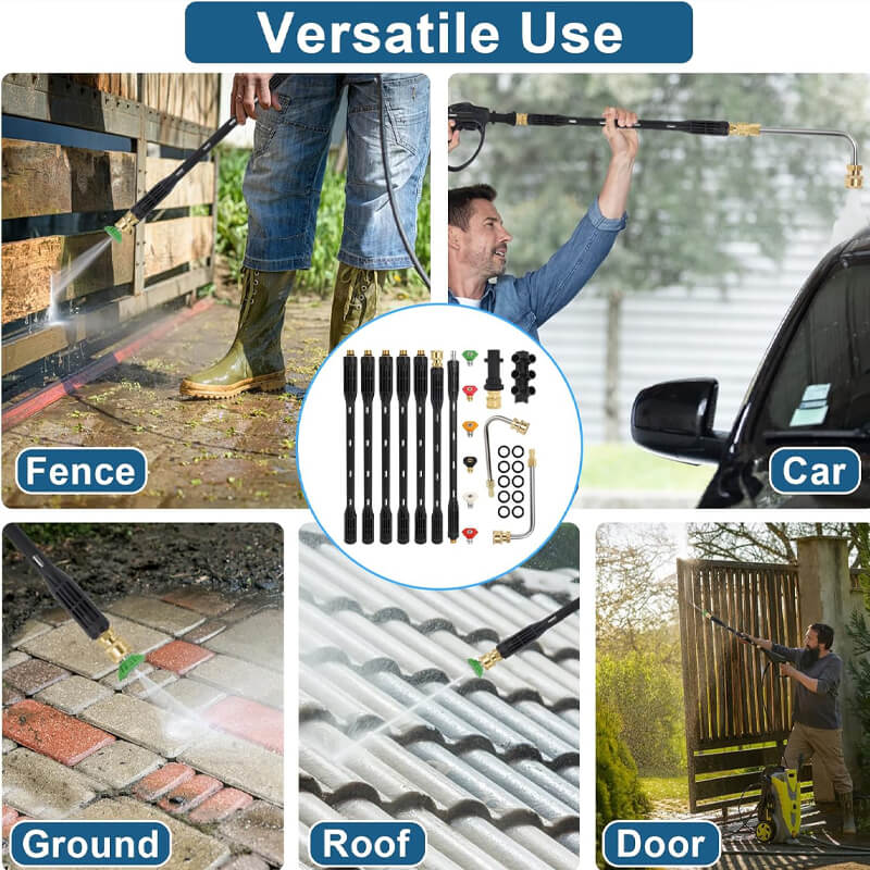 Comes with a 30° U-shaped attachment rod, a 90° curved attachment rod and, suitable for all pressure washers with 1/4" quick connector, or the nozzle tip can be connected directly to the pressure washer gun.