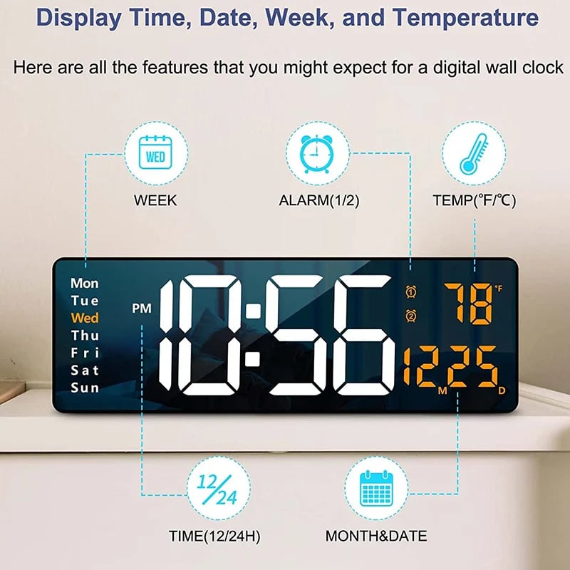 -【Large LED Display W/ Remote Control】Our wall digital clock features a 16 inch large screen and 4.5 inch clear jumbo digits, which makes it easy to view and read the time, date, indoor temperature, and week from a great distance and all angles.the handy remote control allows you to adjust the LED brightness, set the time, alarms, or timer without having to get up from your seat.