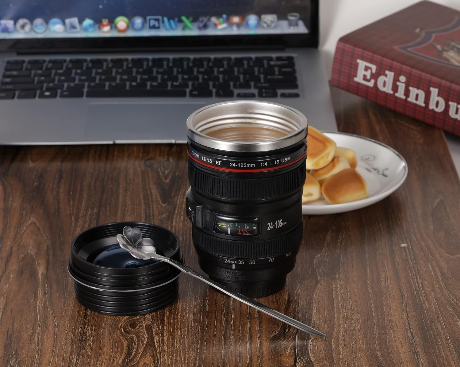 ✅ A MUST-HAVE FOR PHOTOGRAPHY LOVERS: Calling all photographers (and those who simply love cool mugs)! This coffee thermos is a spot-on replica of a Model EF 24-105mm Camera Lens. It's a must-have for anyone who’s ever used a camera or just likes a little novelty in their life. It’s not just a mug — it’s a conversation starter that’ll make you the star of the office or your next Zoom meeting. And yes, it comes with TWO lids: the Retractable Sipper Lid for those casual sipping days, and the Camera Lens Lid for when you’re feeling extra fancy. Plus, there’s a stainless steel spoon to stir in all your “camera-ready” mix-ins.